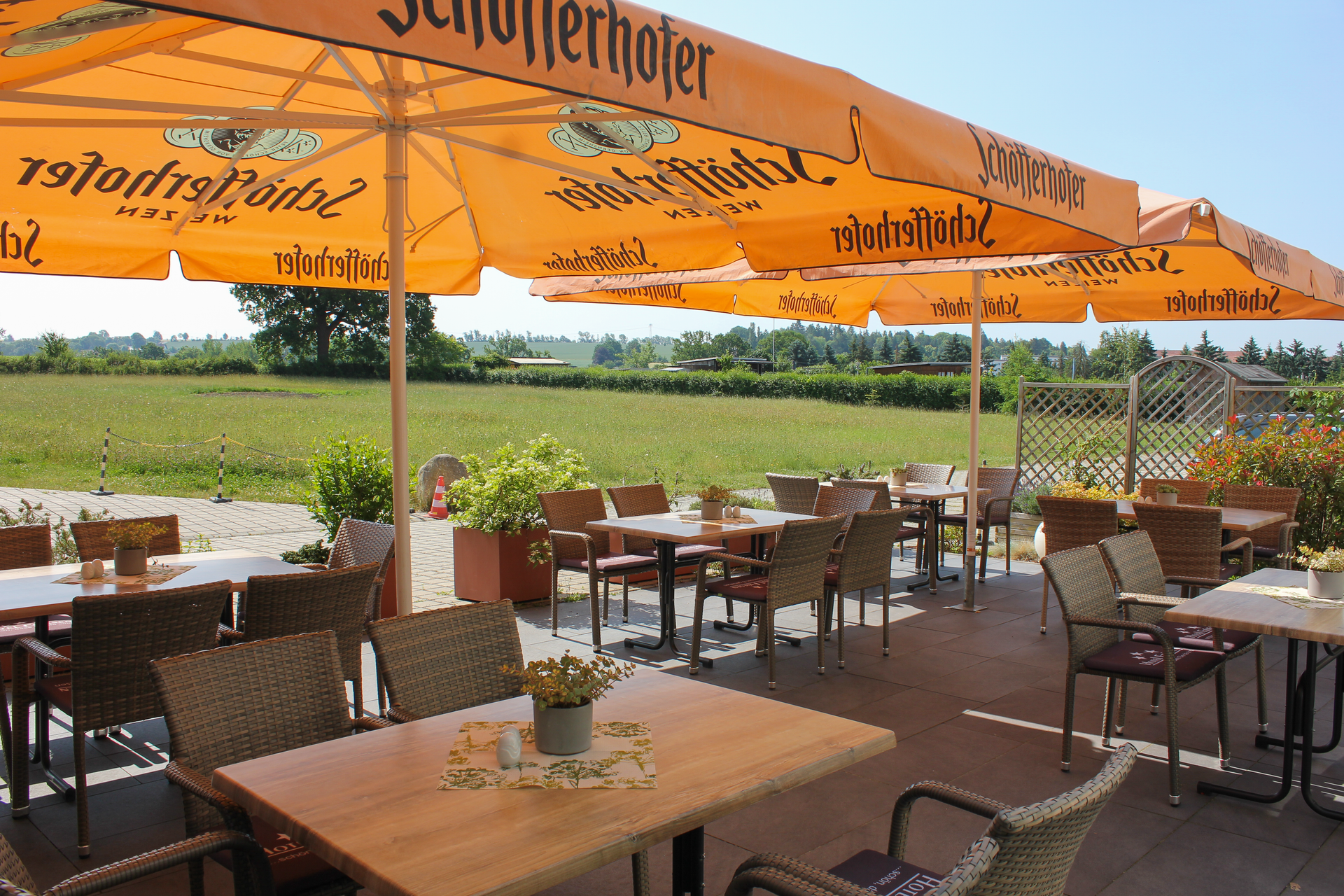 Auf unserer Terrasse genießen Sie sonnige Stunden: Eine Seite bietet rund 40 Sitzplätze, die andere etwa 50 – beide angenehm beschattet durch große Sonnenschirme.